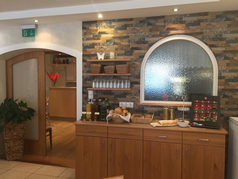 Frühstücken Sie im freundlichen, sonnendurchfluteten Frühstücksraum oder auf der schattigen Terrasse im blumengeschmückten Innenhof!