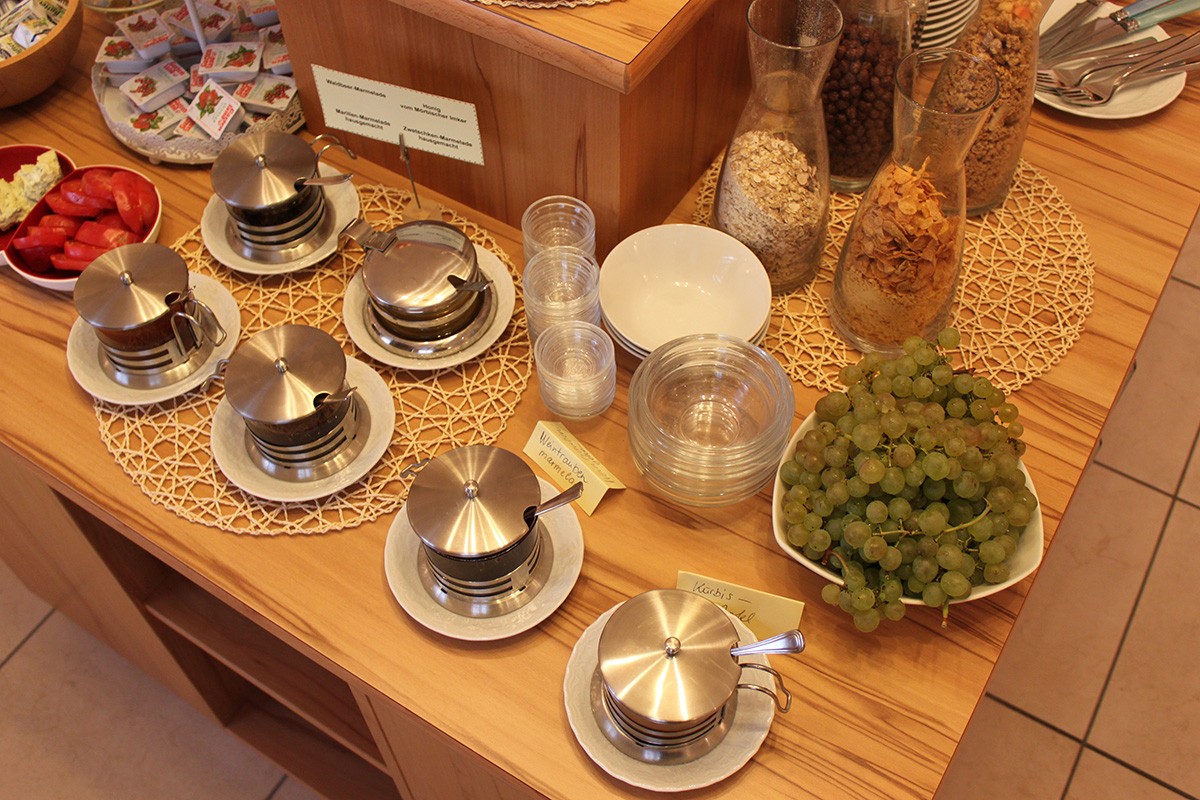Ein reichhaltiges Frühstücksbuffet lädt zum Schlemmen ein: Herrliches Gebäck und verschiedenes Kornbrot aus der Dorfbäckerei, Käse, Wurst, Schinken, Müsli und dazu ein gekochtes Frühstücksei! Ein Glas von unserem Traubensaft lässt Sie wissen: "Sie sind beim Weinbauern zu Gast"!